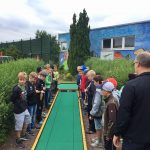 Unser Rückweg führte uns über den KuDamm, entlang der noch vorhandenen Mauer zurück nach Marzahn, denn hier starteten wir um 11.00 Uhr mit dem Minigolf. In 3’er Teams bespielten unsere Kids die vielen Bahnen der Anlage. Neben leckerer Braus, wurde nach dem Minigolf noch gegrillt und gemütlich beieinander gesessen.