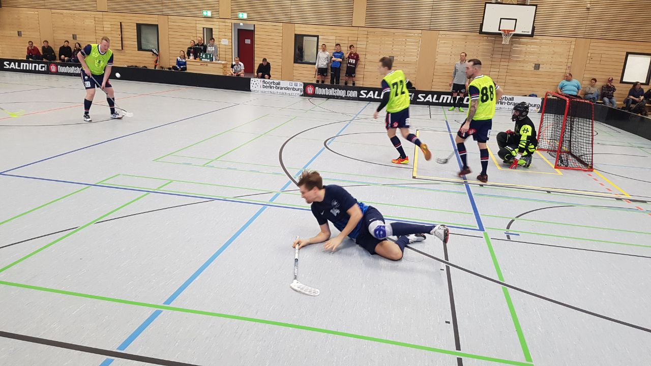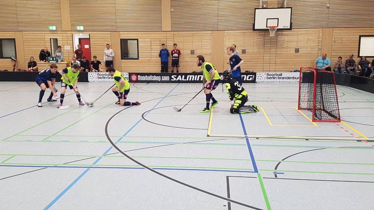 Mannschaftsleiter Micha nahm das Team noch mal zusammen. Klar mußte weiter so konzentriert gespielt werden, denn 3 Tore sind keine all zu große Hürde zur Halbzeit. Und so lief die 2. Hälfte ein bißchen so wie die Erste. Bis in der 9. Spielminute Hannes Fielko mit seinem 1. Tor des Spieles das 4:0 erzielen konnte. Rangsdorf hatte dann 2 ganz bittere Minuten. Milde erhöhte nur 22 Sekunden später auf 5:0 und eine knappe Minute später traf Robbi Haschker von hinter der Grundlinie zum vorentscheidenden 6:0 – übrigens auch das 100. Tor in der Geschichte der Floorball-Eisbären Juniors. Rangsdorf nahm eine Auszeit und ab jetzt wurde das Spiel immer bissiger und mit etlichen Nicklichkeiten geführt. Nach 31 torlosen Minuten trafen die Vorstadt-Berliner dann auch mit einem sehenswerten Schuß ins Kreuzeck zum ersten Mal in diesem Spiel das Tor. Als kurz danach Diores mit einer 2 Minuten Strafe (Nachschlagen) vom Platz mußte, versuchten die Ranksdorfer noch mal alles, kamen aber zu kaum zu Abschlüssen und wenn doch, war Stohler zur Stelle. Die Strafe wurde also überstanden und als Diores zurück war schnappte er sich den Ball und ballerte den ins Rangsdorfer Tor – Bähhhm, Danke für die Strafe …..