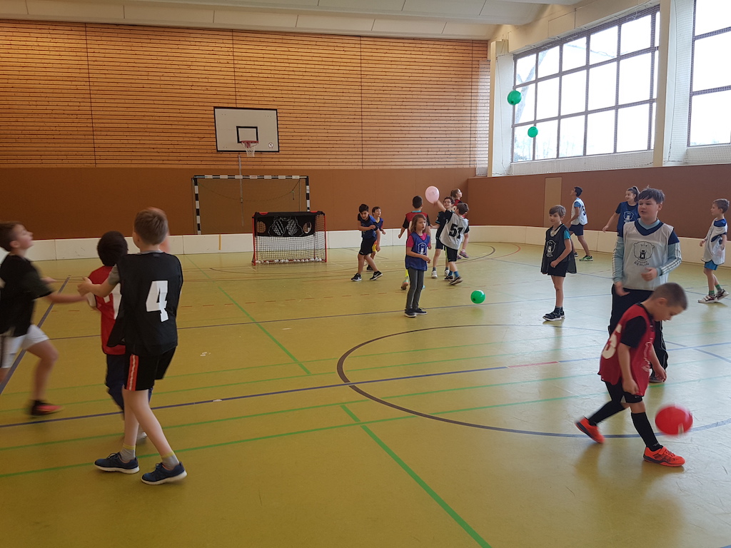 Statt Lauf ABC gab es heute Floorball-Fußball. Was das ist? Fußball mit Floorball und Floorballregeln (Ball darf nur einmal mit dem Fuß gespielt werden, dann muss entweder Mitspieler oder Gegner den Ball berühren). Die Ausnahme zum Floorball war: Natürlich durfte man mit dem Fuß ein Tor erzielen, es wurde ja ohne Schläger gespielt. Den Kids macht das Spiel als Erwärmung übrigens viel Spaß und schult die Zusammenarbeit, Freilaufen und Anbieten. Danach Dehnung und rein ins Thema des 2. Tages: Passen und Schießen. Bis zur Mittagspause gab es verschiedene Übungen und Challenges fürs Punktekonto rund um das Thema Passen. KOPF HOCH! waren wohl die meist gebrauchtesten Worte der Coaches (Robbi wurde Donnerstag und Freitag noch von Chris aus dem Verbandsliga-Team unterstützt) an diesem Vormittag. Das war allerdings nicht als Aufmunterung, sondern als Aufforderung, beim Passen den Kopf hoch zu nehmen, gemeint.