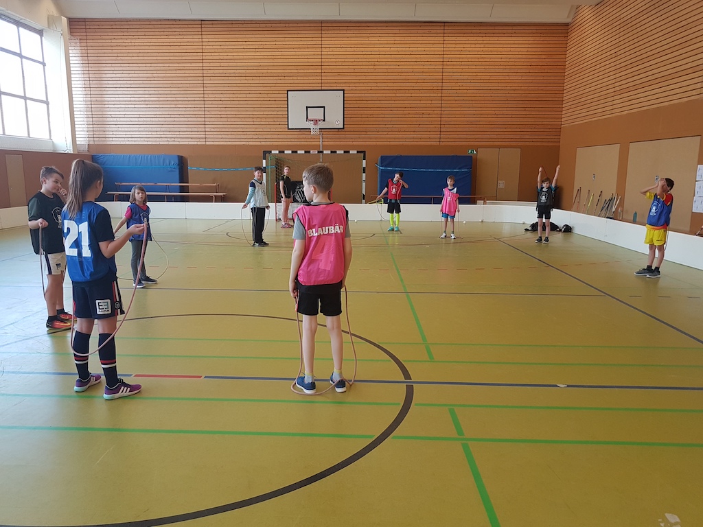 “Kinder jetzt gibt es Eure Lieblingseinheit des Tages – Athletik” ….. “Mrrrrrrrrrrhhhhhhhhhhhhhh”. Bevor es allerdings losging, wurde das Thema “Schussblocken” noch einmal ausführlich behandelt und die beliebte HU-HA-Übung absolviert (Video). Danach stand Kondition auf dem Programm: Liegestütze (auf Knien), Seilspringen, und zwei Übungen mit Bällen unter und über dem Körper waren die 4 Stationen, die alle 2x durchliefen. Danach wurden die Rundenzahlen fürs um die Halle rennen noch mal um eine Runde im Vergleich zum Vortag erhöht.