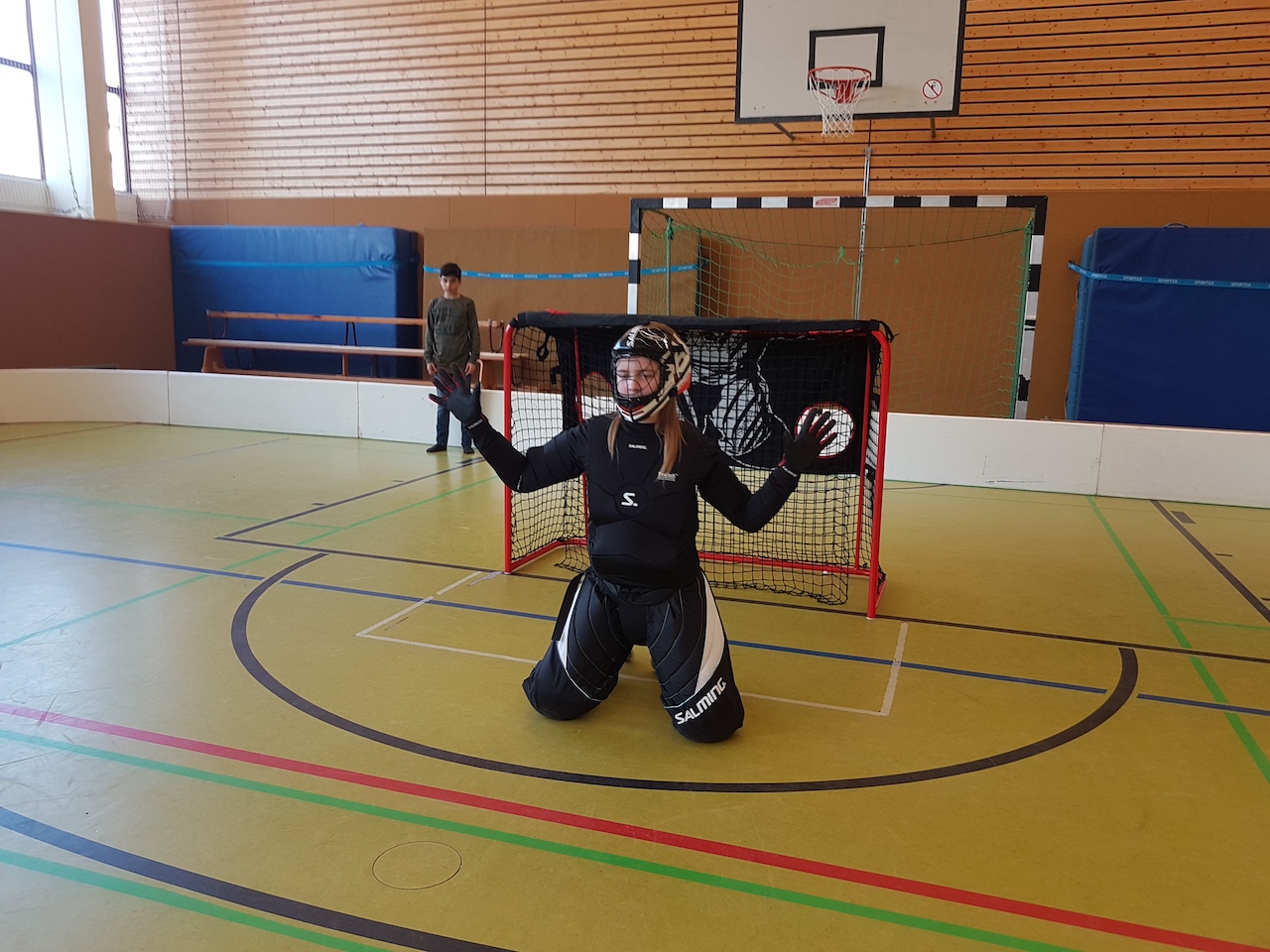 Schusstraining – und endlich ging es auf große Tore. Torhüterin Valeria konnte den Schläger aus der Hand legen und ihre “geliebten” Torwartklamotten anziehen. Und so versuchten sich jeweils zwei Teams auf Torhüter oder Torwand in den verschiedenen Schusstechniken, wobei der gezogene Handgelenkschuss und “Kopf hoch” die wichtigsten “Themen” waren. Zum Schluss gab es noch eine Runde Penaltyschießen.
