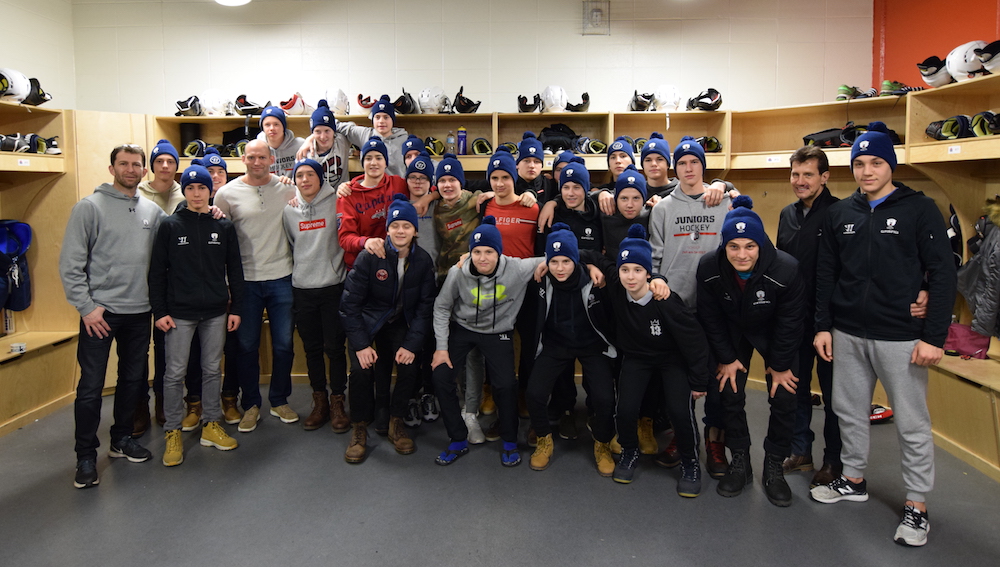 Zu meiner Überraschung traf sich ein Teil der Mannschaft im Fitnessbereich des Hotels und war sehr früh schon sportlich aktiv. Da die Vorgängerteams der Juniors immer einen guten Eindruck beim Personal des Hotels hinterlassen hatten, ließ sich Hubert, der aus Kärnten stammende Frühstückskellner des Delta Hotels, extra für uns zum Dienst einteilen und begrüßte uns sehr herzlich. Die Wiedersehensfreude war groß und es gab viel zu erzählen. Nach dem Frühstück ging es wieder in die Winsport-Arena, wo das Team von Robin Regehr, einem langjährigen NHL-Spieler mit der Erfahrung von mehr als 1.000 NHL-Spielen, empfangen wurde. Aus dem Stand und ohne Berührungsängste entwickelte sich eine interessante Talk-Runde, wobei die Jungs mit interessanten Fragen und gutem Englisch aufwarteten.