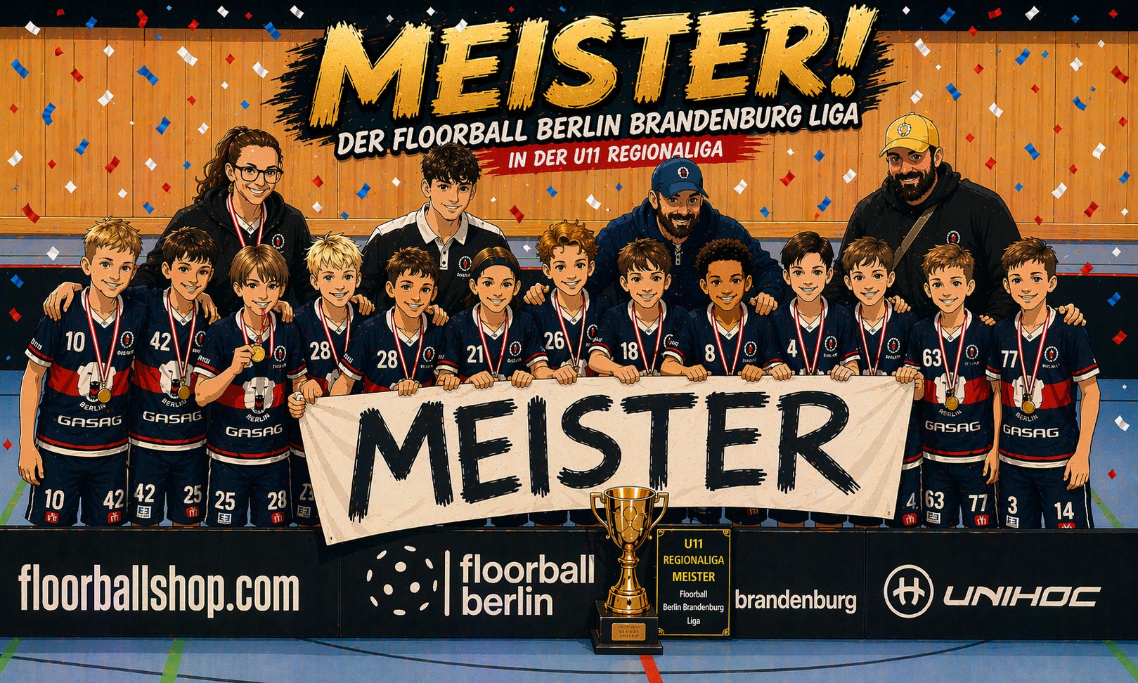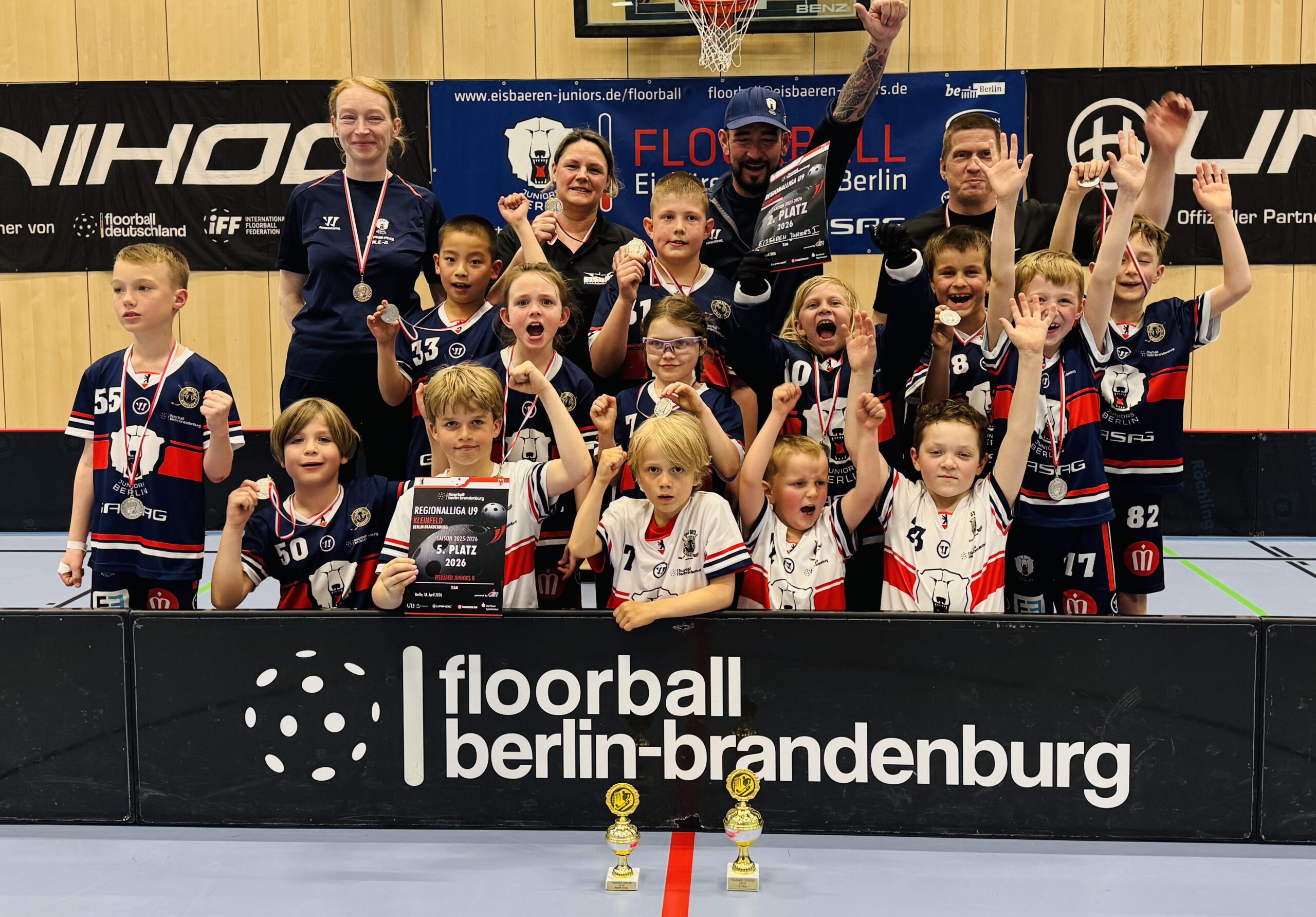 Mit zwei sensationellen und vor allem temporeichen Spielen sichern sich die Kids der Floorball Eisbären Juniors die Meisterschaft in der Regionalliga. Nach einem überzeugenden 7:1-Halbfinalsieg gegen den SC Potsdam und dem damit verbundenen Einzug ins Finale krönten sie ihre Leistung mit einem starken 5:2-Erfolg gegen den UHC Berlin. Die Coaches Robbi und Domi waren sich einig – auf den Punkt war die Mannschaft da, wo sie am Ende der Saison sein sollte, mit einem extrem temporeichen Spiel über 4 Reihen, ließen wir den Gegnern kaum Chancen – und wenn doch waren sie meist Beute unseres gut aufgelegten Goalies. Die Kids spielten an diesem Tag die beiden besten Spiele der Saison und sicherten sich zu Recht die Meisterschaft in der Regionalliga Kleinfeld U11 des FVBB.